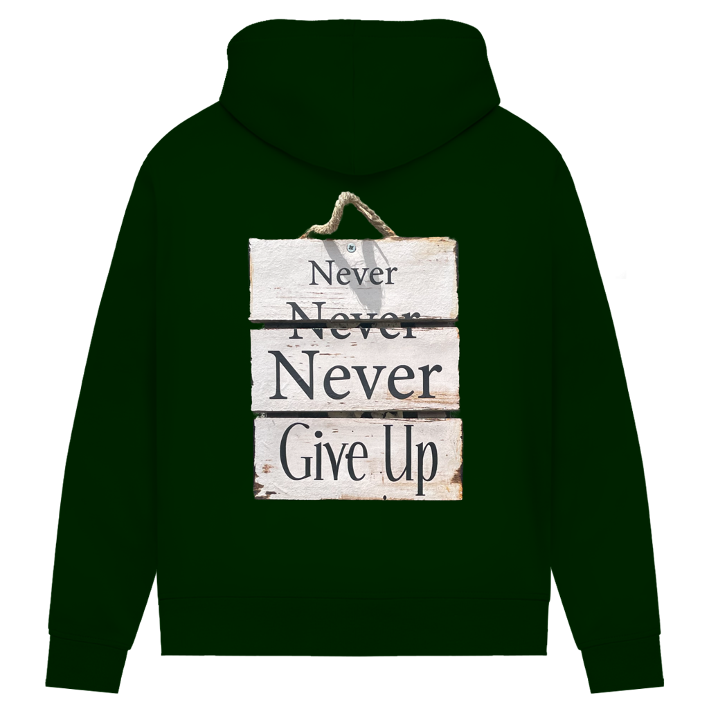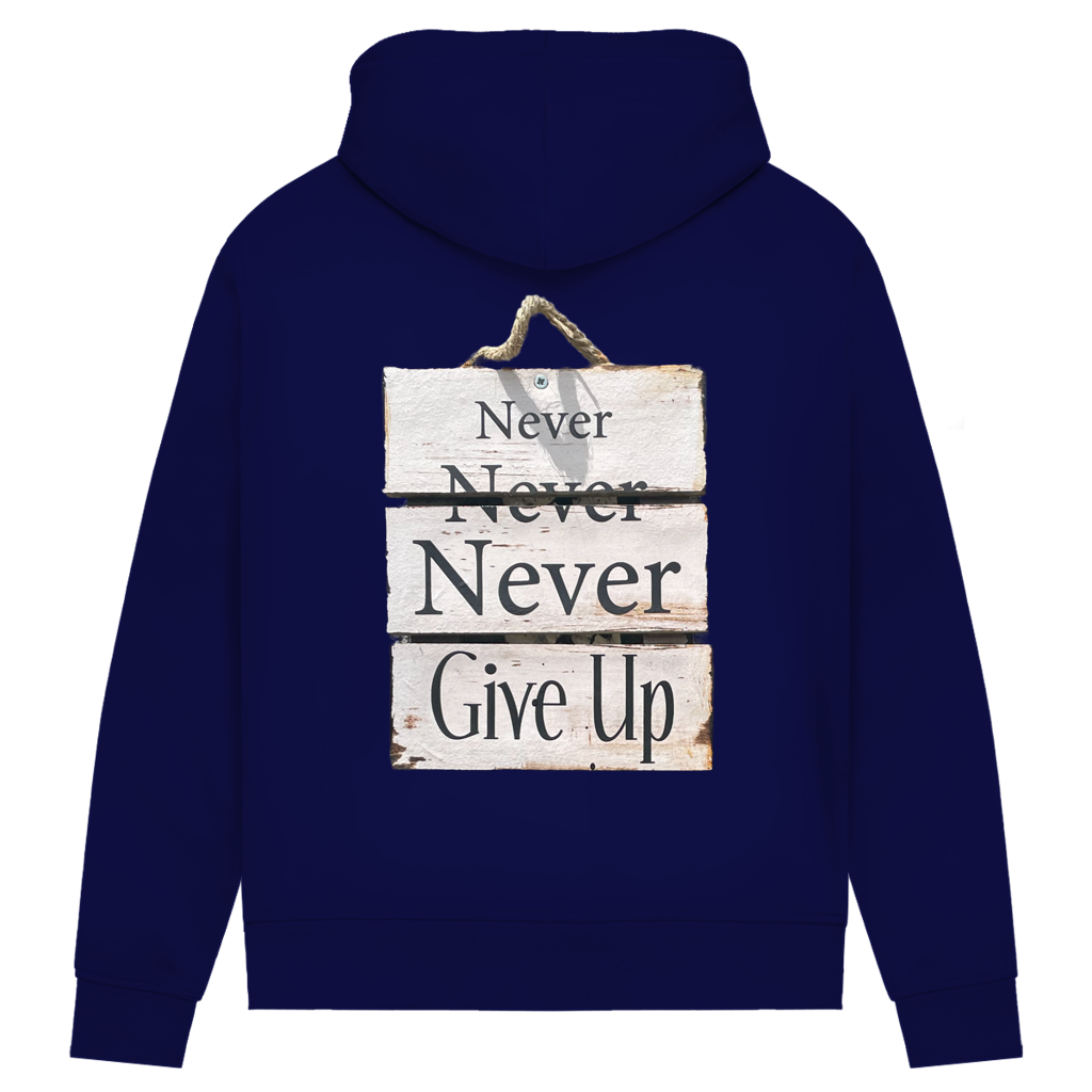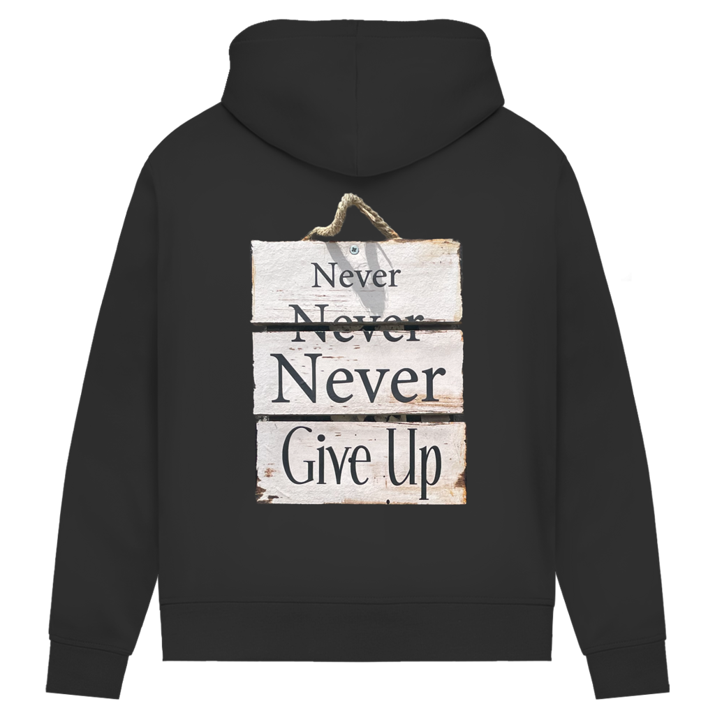 Der ausdrucksstarke Rückendruck „Never give up“ macht diesen Hoodie zu einem stillen Begleiter, der dich immer wieder daran erinnert, an dich selbst zu glauben.
