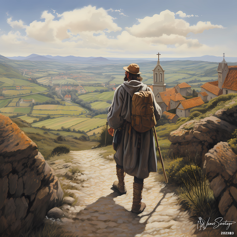 Unser Design2023#5 *Pilger blickt über das Land* erfasst den einzigartigen Moment, wenn ein Pilger über das Land blickt und spürt, dass sein Tagesziel in greifbarer Nähe liegt. Es ist ein Symbol für deine eigene Reise, sei es auf dem Camino oder im Leben selbst. Dieses Motiv erinnert dich daran, dass jeder Schritt, den du unternimmst, dich näher an deine Ziele bringt.