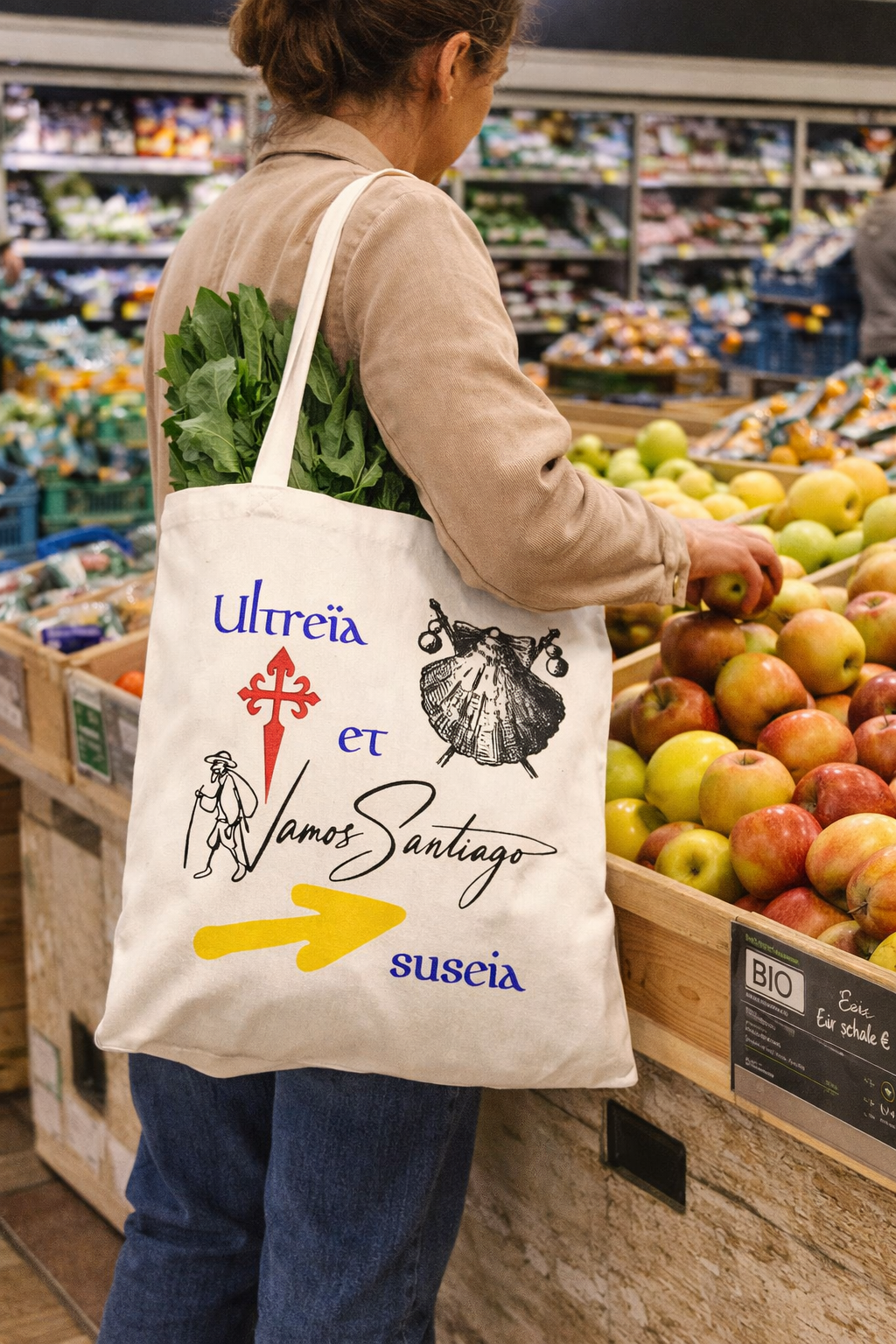 Jede Tasche ist mit einzigartigen Designs veredelt, inspiriert von den Symbolen, Farben und der SpiritualitĂ€t des Jakobswegs. So trĂ€gst du die Energie des Camino immer bei dir â egal, ob beim Einkaufen, Pilgern oder im Alltag.